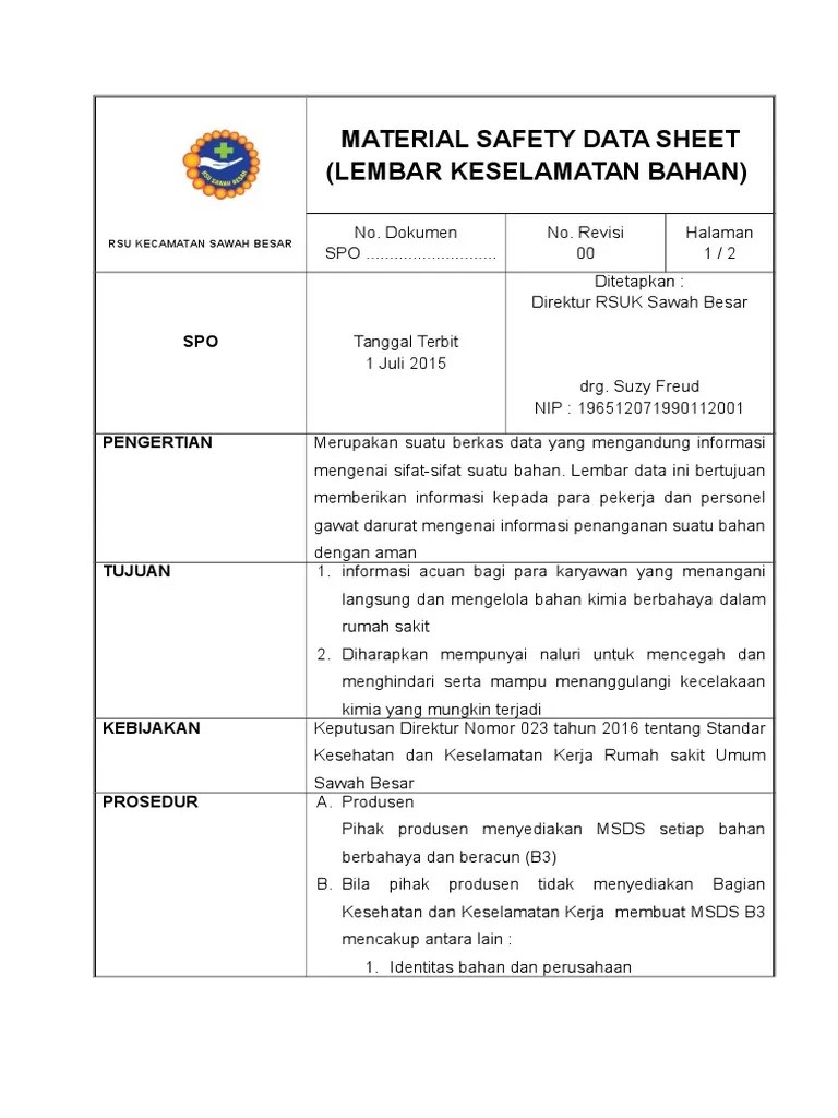 Contoh kasus lainnya, zat kimia yang tertumpah telah terkontaminasi oleh . Material safety data sheet (msds) bagian 1 identitas bahan dan perusahaan (chemical . Lembar data keselamatan bahan atau material safety data sheet (msds). Msds, perusahaan akan mendapatkan manfaat tentang bagaimana cara yang aman. Msds (material safety data sheet) atau lembar data keselamatan bahan merupakan kumpulan data keselamatan dan petunjuk dalam .
